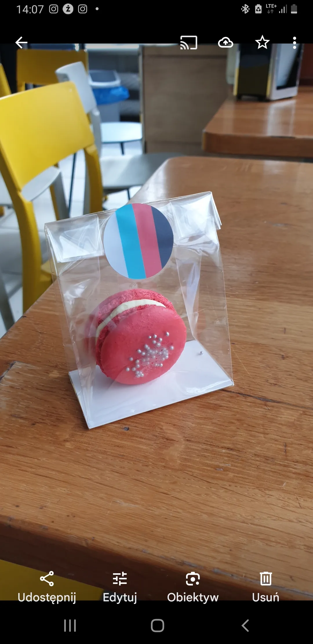 Zestaw zawiera 1 makaronik w transparentnej torebce z prostokątnym dnem.