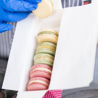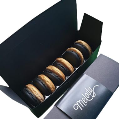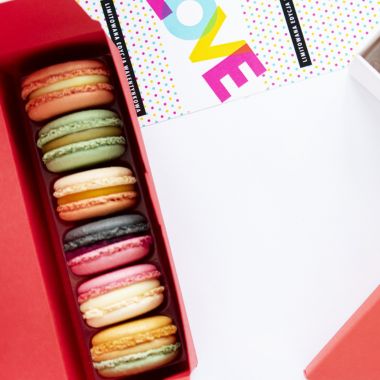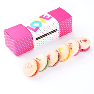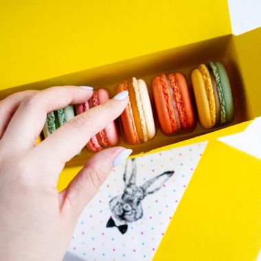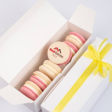 Zestaw zawiera sześć makaroniki w tekturowym pudełku z wypraską zabezpieczającą w środku. Pudełko może być owinięte wstążką w wybranym kolorze, zadrukowaną owijką lub zaklejone naklejką.