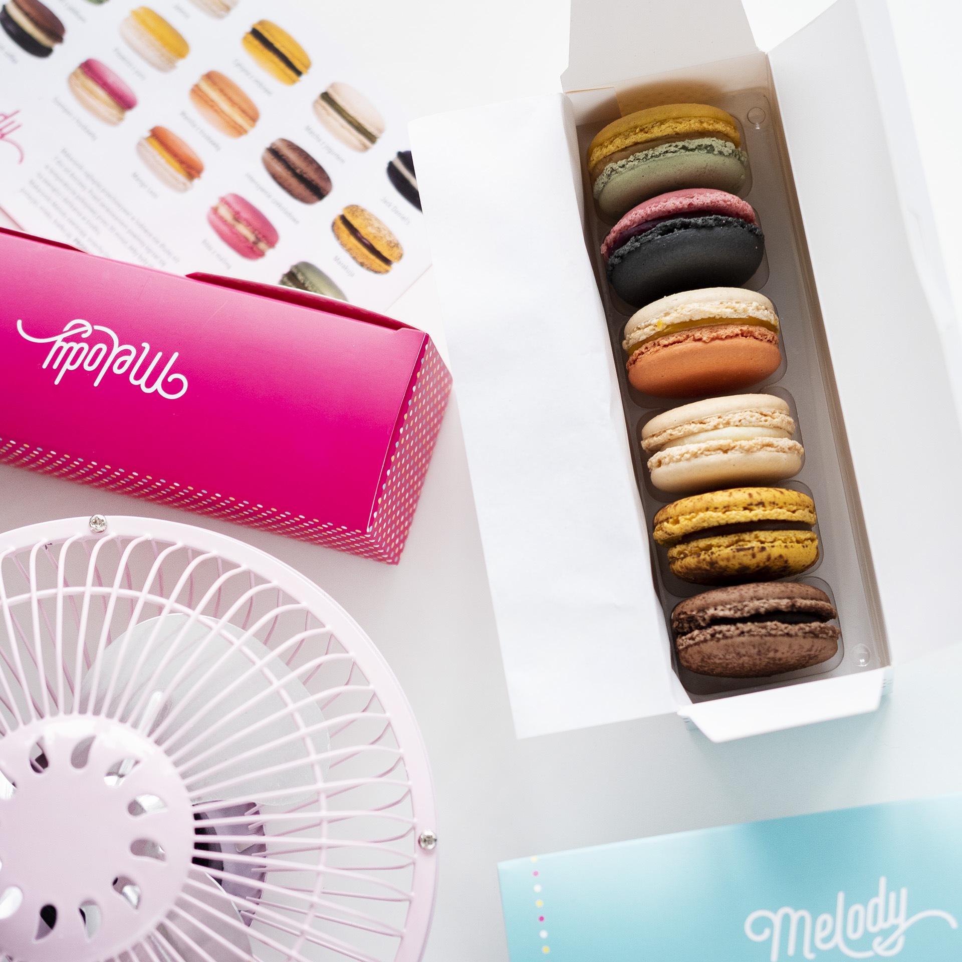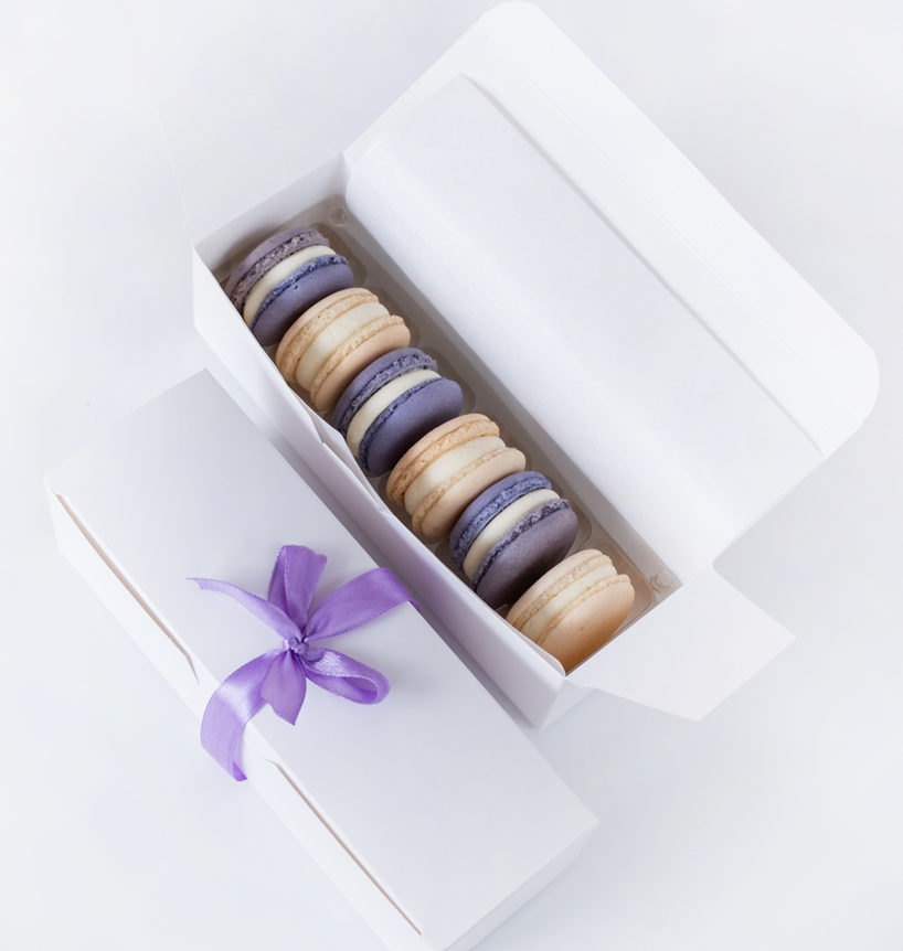 Zestaw zawiera 6 makaroników pieczonych w naszej warszawskiej pracowni przez doświadczonych cukierników. Makaroniki wysyłamy zapakowane w eleganckim opakowanie wykonanym z litej tektury. Rozmiar pudełka (dł. x szer. x wys.): 18